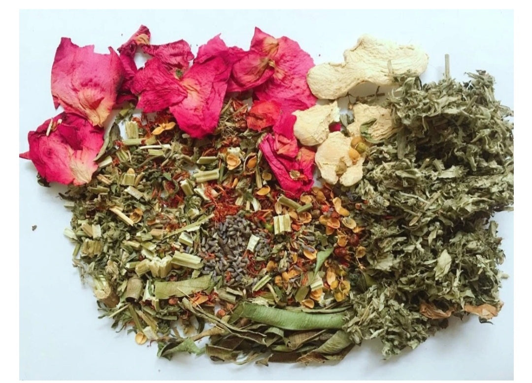 Aloe vera, agripaume, romarin, armoise, lavande, calendula, pétales de rose, albizia, origan, carthame, basilic. 100% bio.